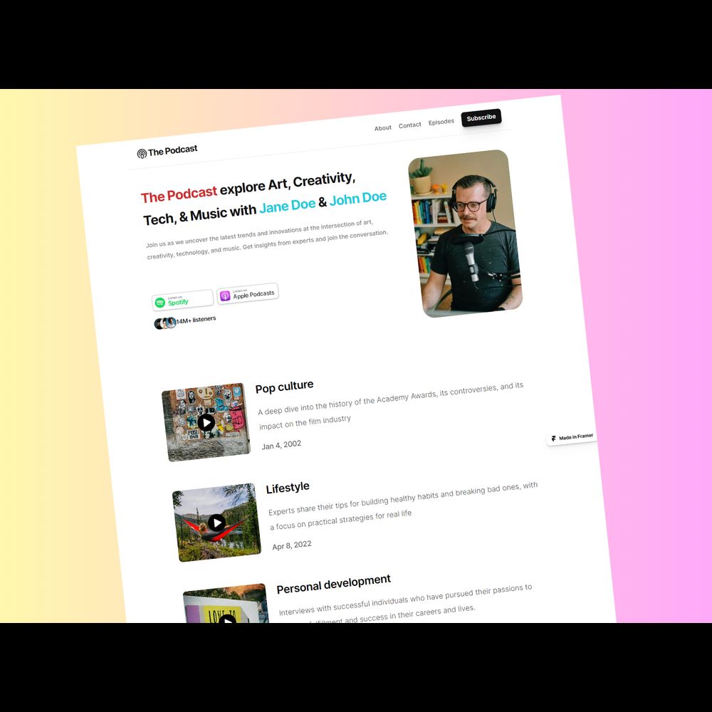 Demo Link --> https://thepodcast.framer.website/ Features Home, About, Contact, and Subscribe pagesIntegration with Apple Podcast and SpotifyFully responsive designTestimonials and notes sectionsCMS for managing episodesCool animationCustomizable design to fit your brandUser-friendly and easy-to-use interface. π‘ What is included in the podcast website template? π» The template includes a Home, About, Contact, and Subscribe page, along with sections for showcasing testimonials π£οΈ and notes π. It also includes integration with Apple Podcast π and Spotify π§, a CMS for managing episodes ποΈ, and cool animation π₯. π What is the purpose of the Home page? π§ The Home page serves as the main landing page for your website and is the first thing your audience will see. It includes a brief introduction to your podcast and provides easy access to your latest episodes. π¨ Can I customize the template to fit my brand? β Yes! The template is fully customizable, so you can tailor it to fit your brand and personal style. ποΈ How does the CMS work for managing episodes? π» The CMS is an easy-to-use platform that allows you to upload, organize, and manage your podcast episodes from one central location. This makes it easy for you to keep track of your content and for your audience to access your latest episodes. π How does the integration with Apple Podcast and Spotify work? π§ The integration with Apple Podcast and Spotify allows you to embed your podcast directly on your website. This makes it easy for your audience to access your content and subscribe to your podcast through these popular platforms. π£οΈ What is the purpose of the testimonials and notes sections? π§ The testimonials section allows you to showcase positive feedback from your audience, while the notes section provides additional information for your listeners to follow along with your podcast. These features help to engage your audience and keep them informed about your content. π₯ How does the animation add to the user experience? π The cool animation adds a fun and interactive element to your website, making it more visually appealing and engaging for your audience. This can help to keep your listeners engaged and improve the overall user experience.